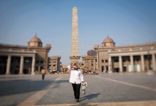 2012年11月6日,嘉兴市区的罗马都市,一位妇女从“圣彼得广场”经过时,用手挡着刺目的阳光。罗马都市是一个高档的欧式住宅小区,据说有浓郁的意大利罗马风情。