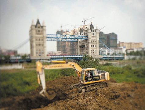 2012年9月28日,苏州相城区,挖掘机正在“伦敦塔桥”旁施工,这里又将克隆什么建筑呢?