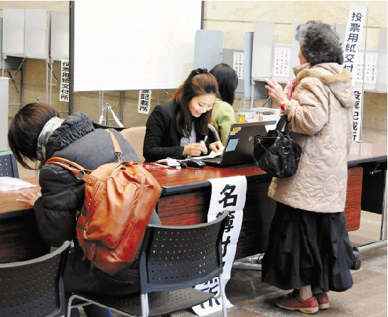 12月16日,日本选民在大阪一投票站办理投票手续。 新华社记者 马兴华 摄
