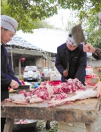高山膘羊是农家宴的大菜,村里的大伯大叔群起宰之,他们刀起肉成块,利索!不愧为农家宴厨房里的好刀手。 洪东升 摄