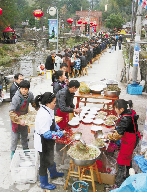 来的人太多了,只能在露天搭台分菜了,快点,远处的客人在等我们上菜啊! 金亮亮 摄