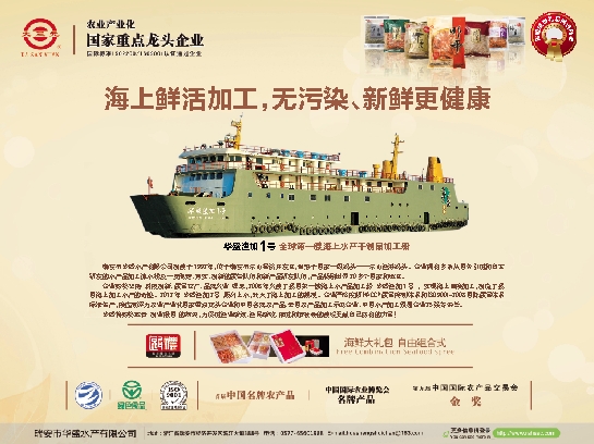 企业始终坚持“科技创新、质量立厂、品牌兴业”理念,2006年兴建了我国第一艘海上水产品加工船“华盛渔加1号”, 实现海上直接加工,创造了我国海上加工水产的奇迹。2012年“华盛渔加2号”顺利上水,壮大了海上加工的规模。企业严格按照HACCP质量控制体系和ISO9001-2008国际质量体系标准生产,接连被评为农业产业化国家重点龙头企业和中国名牌农产品、全国农产品加工示范企业、中国水产加工贸易企业25强等荣誉。