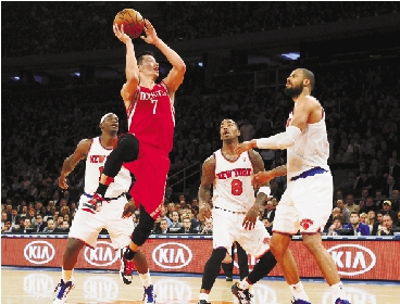 火箭队球员林书豪(左二)在比赛中进攻。 新华社发