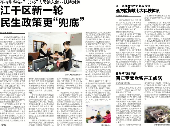 据统计,2005年至今,江干区先后实施的三轮民生政策,都特别对就业政策做了大范围调整,也带来了积极效果。2010年至2011年,江干全区建立了12个创业孵化平台,69个就业援助平台,全区新增5.6万个就业岗位,帮助3.5万失业人员实现再就业,其中困难人员1.8万人,征地农转非人员1.03万人。