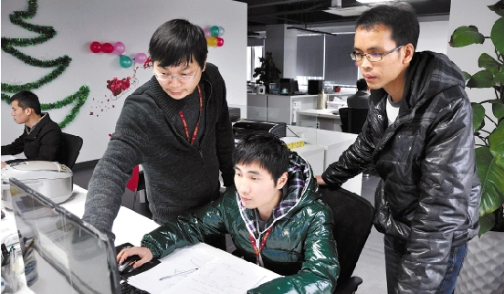 马超(左一)正在指导公司员工进行画图设计。 王庆丽 摄