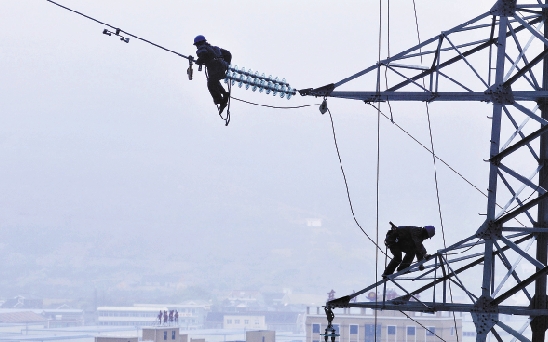 12月21日,舟山电力工人顶风冒雨在金塘岛110KV山潭输变电工程铁塔上架线。