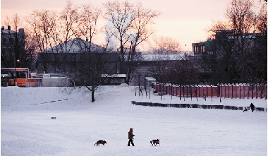 12月19日,在俄罗斯首都莫斯科,一名市民带着宠物狗在冰封的湖面上行走。 新华社记者 姜克红 摄