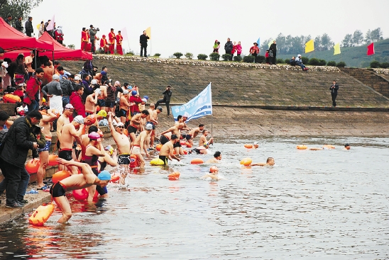 12月22日,450余名冬泳爱好者在武义石鹅湖参加冬泳等联谊活动。