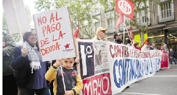 7岁的戴维(前)在西班牙首都马德里和母亲参加一场示威游行,他手中的牌子上写着“拒绝偿还债务”,但是他并不清楚那是什么意思。 新华社发