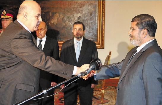 埃及总统穆尔西(右)在首都开罗与新任命的副总统马哈茂德·马基握手(资料照片)。 新华社发