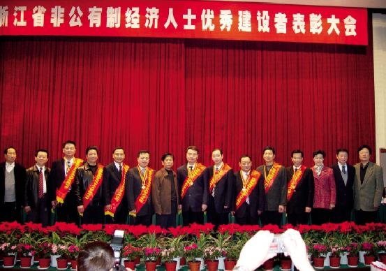 近年来,在非公有制经济领域,涌现了一大批优秀的非公有制经济人士,为浙江经济社会发展作出重大贡献,得到了党委、政府的表彰和社会各界的肯定。图为2005年,部分全国和省优秀中国特色社会主义事业建设者与省工商联领导班子合影。