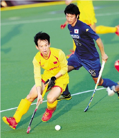 12月23日,中国队球员蒋希上(左)在比赛中。当日,在卡塔尔进行的第二届亚洲曲棍球锦标赛比赛中,中国男子曲棍球队以4比2战胜日本队。 新华社发