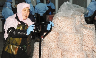 今年以来,舟山市越洋食品有限公司积极拓展外贸市场,虾仁出口不断增长。图为公司员工在包装虾仁,准备出口欧盟。 姚峰 摄