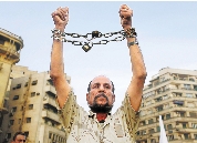 埃及抗议者用铁链锁住自己双臂。