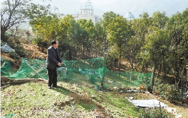 柴如安在喂养林地鸡。