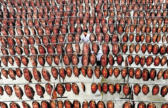 12月25日,杭州余杭区仁和街道一家鱼干作坊内,数千条剖好的青鱼整齐地晾晒在铁架上。这批鱼干将在春节前供应杭州、上海等地。 唐永春 陈连孝 摄