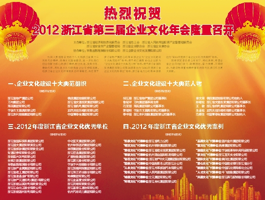 为深入贯彻落实党的十八大和浙江省第十三次党代会精神,助推文化强省建设,进一步弘扬以创业创新为核心的浙江精神,树立先进,发挥示范、激励作用,用先进文化引领我省企业可持续发展。经浙江省企业文化评审委员会评审确定,决定授予浙江省物产集团公司等10家企业为“企业文化建设十大典范组织”称号;授予胡江潮等10位企业家为“企业文化建设十大典范人物”称号;授予浙江省国际贸易集团有限公司等28家单位为“2012年度浙江省企业文化优秀单位”称号,浙江省电力公司等19家单位为“2012年度浙江省企业文化优秀案例”称号。