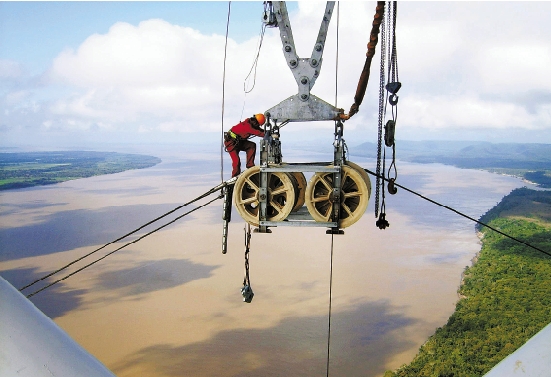 浙江省电力公司负责施工的500千伏巴西亚马逊河大跨越工程,日前顺利完成架线主体施工,使南美两基最高输电铁塔成功实现“牵手”。图为浙电工人在亚马逊河上架设电线。