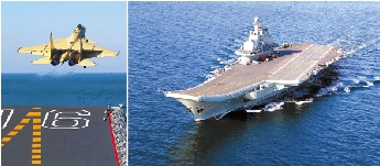 7、左图:歼—15舰载机在“辽宁舰”上滑跃起飞。右图:“辽宁舰”出海进行科研试验和海上训练。 新华社发