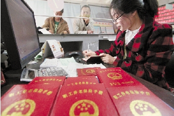 9、2012年4月25日,在山东省临沂市郯城县人力资源和社会保障服务大厅,工作人员在办理养老保险业务。 新华社发
