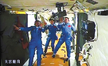 5、2012年6月18日北京航天飞控中心大屏幕显示的画面:航天员景海鹏、刘旺、刘洋在天宫一号实验舱内。 新华社发