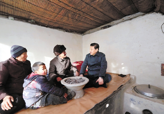 12月29日至30日,中共中央总书记、中央军委主席习近平在河北省阜平县看望慰问困难群众。这是习近平在龙泉关镇骆驼湾村看望唐荣斌老人一家。