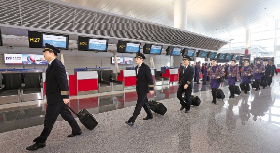图为新航站楼首航的厦航机组人员准备登机。 本报记者 林云龙 摄