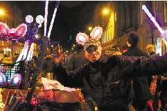 在英国苏格兰首府爱丁堡举行的庆新年火炬游行活动中,一名男子在街头挥舞荧光棒。 新华社发