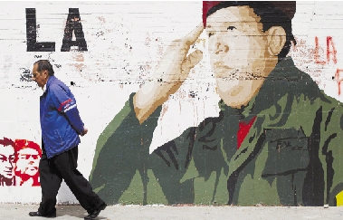 12月30日,一名男子从委内瑞拉首都加拉加斯街头的委内瑞拉总统查韦斯的壁画旁走过。 新华社发