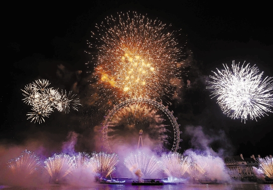 2013年1月1日,烟花在英国伦敦著名地标“伦敦眼”上空绽放,庆祝新年到来。 新华社发