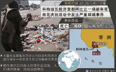 据科特迪瓦国家电视台当地时间2013年1月1日报道,在科经济首都阿比让2012年12月31日晚举行的一场新年夜烟花庆祝活动中发生严重踩踏事件,造成约60人死亡。有媒体援引军方救援负责人伊萨·萨科的话说,初步统计的伤者人数已达200人。但也有媒体报道说,受伤人数为48人。 新华社记者 施鳗珂 编制 |