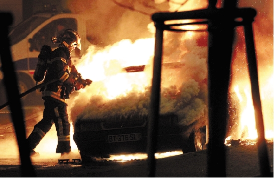 1月1日,在法国东部的斯特拉斯堡,消防员给一辆燃烧的汽车灭火。 新华社发