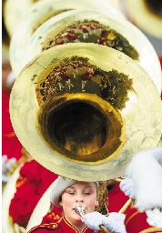 1月1日,在美国加利福尼亚州帕萨迪纳,乐队成员在玫瑰花车游行中行进。当日,第124届帕萨迪纳玫瑰花车游行在这里举行。帕萨迪纳玫瑰花车游行有100多年历史,被认为是除纽约时报广场新年倒计时活动之外,美国境内规模最大、吸引观众最多的新年活动。 新华社记者 杨磊 摄 |