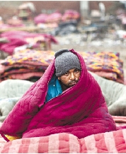1月3日,在与印度首都新德里毗连的德里旧城,一名无家可归的男子裹着棉被坐在户外。