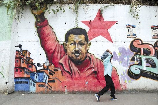 1月1日,在委内瑞拉首都加拉加斯,一名行人从总统查韦斯的壁画旁走过。 新华社发