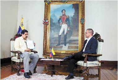 1月4日,委内瑞拉副总统马杜罗(左)在加拉加斯和委内瑞拉新闻和通信部长埃内斯托·比列加斯一起参加电视节目。马杜罗当天表示,无论查韦斯1月10日能否出席宣誓就职仪式,他仍将继续履行总统职责。 新华社发