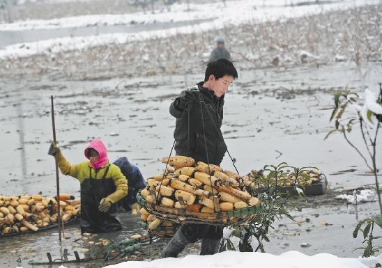 1月5日,在杭州余杭区龙旋村结了冰的荷花塘里,安徽籍承包户阮全学一家在采莲藕,以便卖个好价钱。