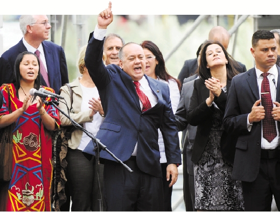 1月5日,在委内瑞拉首都加拉加斯,获得连任的国民议会主席迪奥斯达多·卡韦略(中)挥手致意。 新华社发