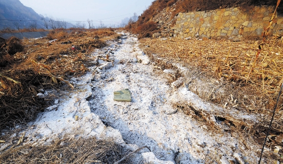 1月6日,山西天脊煤化工集团泄漏苯胺的排污渠现已干涸,并用石灰粉掩埋。 新华社记者 范敏达 摄