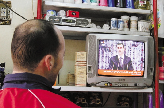 1月6日,在叙利亚大马士革,一名男子观看电视直播叙利亚总统巴沙尔·阿萨德演讲。 新华社发