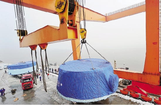 1月8日,萧山临江临时出海码头正在装运出口巴西的水轮发电机定子等大件。该码头是杭州首个出海码头,靠泊能力为2000吨,目前已进入试运营阶段。 本报记者 吴元峰 通讯员 丁 力 汪一航 摄
