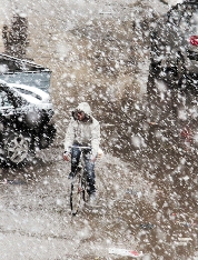 1月9日,在叙利亚首都大马士革,一名男子在雪中骑行。叙利亚本周突遭暴风雪,气温骤降。 新华社发