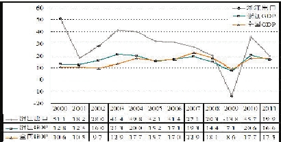 2000年以来,浙江出口增速与全国GDP和浙江GDP名义增速相比,虽然数值不同,但走势相似。 (摘自浙江省商务研究院报告)