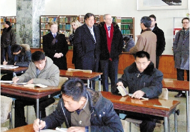 朝中社1月9日提供的照片显示,美国前新墨西哥州州长比尔·理查森和谷歌公司执行董事长埃里克·施密特一行参观朝鲜人民大学习堂(朝鲜国家图书馆)。