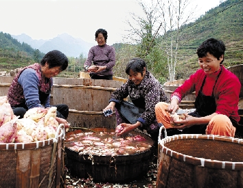 千峡湖库区内的景宁畲族自治县九龙乡岭里村村民在洗红薯,加工粉丝。 陈洁 摄