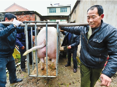 何邦玉帮助乡亲们把大肥猪抬下拖拉机。