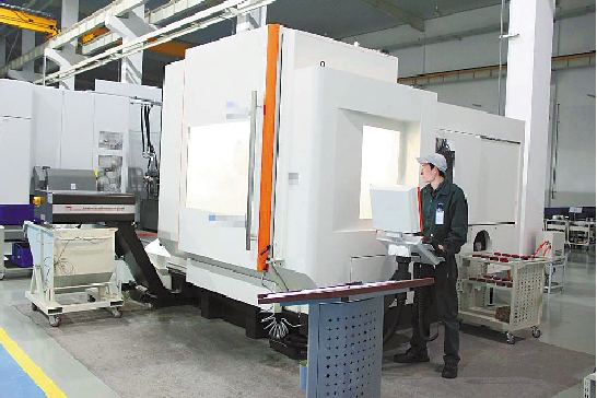 工人正在使用机床加工发动机零部件。