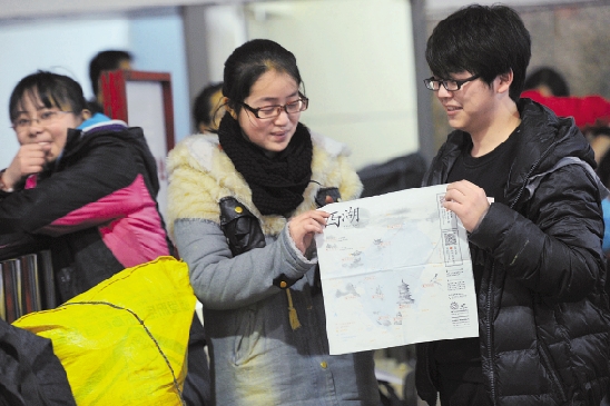 1月13日,杭州高校的学生返乡流已启动。几位返乡的安徽籍大学生在火车站收到免费西湖地图纪念品,十分开心。 本报记者 董旭明 摄