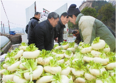 连日来,玉环县干江镇农户忙着向外地客商批发盘菜。盘菜是干江镇特色农产品,今年价格每公斤3.2元。 吴达夫 摄