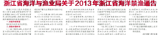 根据《中华人民共和国渔业法》、《浙江省渔业管理条例》和“农业部通告〔2012〕1号”有关规定与要求,结合我省实际,现将2013年我省海洋捕捞禁渔休渔规定通告如下: